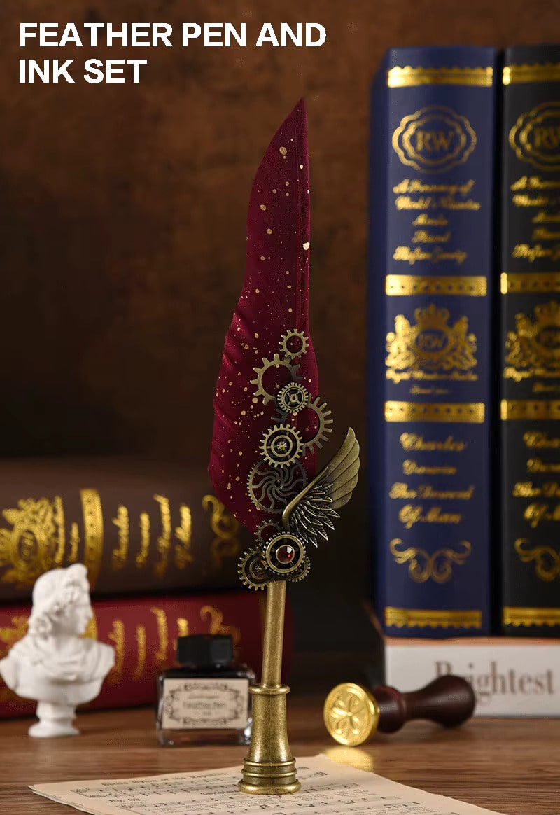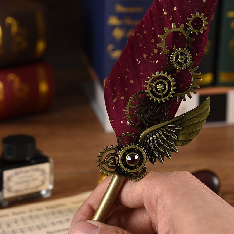 این مورد مهمترین بخش ست کالیگرافی قلم پر نگینی ویژه رنگ قرمز محسوب میشود. قلم پر زیبایی شگفت انگیزی دارد که میتوان گفت زیباترین بخش ست قلم پر است. قلم پر دارای سه بخش پَر و بدنه فلزی و زبانه نگه دارنده قلم است. نوک فلزی به صورت همراستا با دسته قلم وارد زبانه نگه دارنده قلم میشود. شما میتوانید تقریبا هر نوک فلزی را در قلم قرار دهید و بنویسید. قابل تعویض بودن نوک فلزی یکی از ویژگی های خوب این قلم پر به شما میرود.